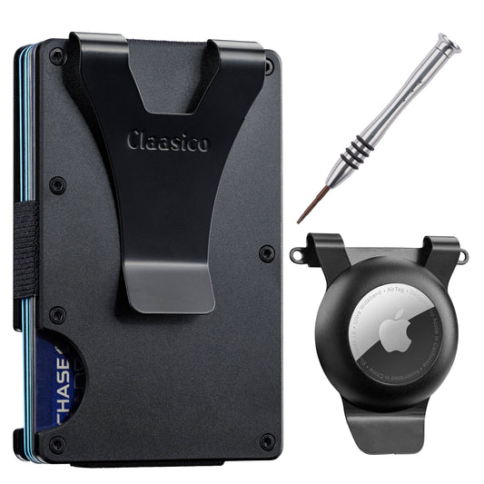 Slim Metal Wallet & Money Clip - Card Holder, Expandable Elastic Strap Compatible with Apple Airtag: Black