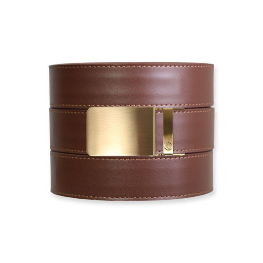 Tough Apparel - Chestnut Top Grain Leather Ratchet Belt & Buckle Set: Brushed Gold / Pant Size 60 or Smaller