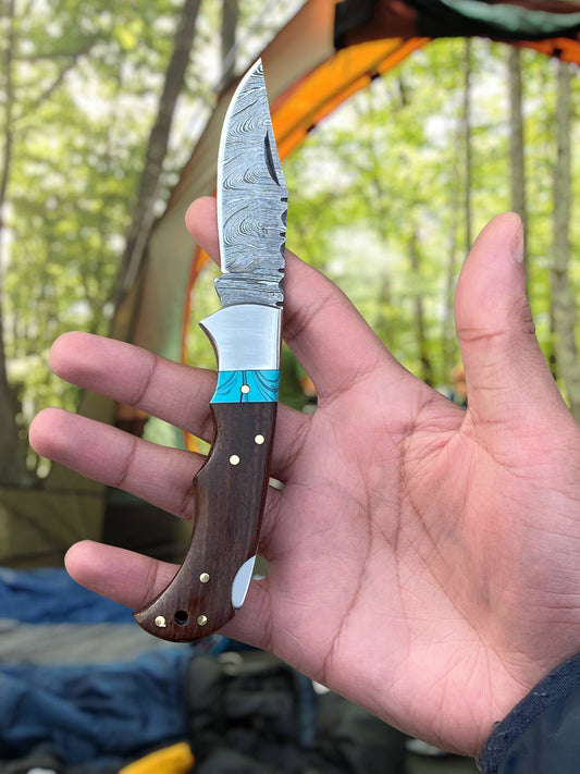 6.5' Handmade Damascus - Wood/Blue (folding knife)