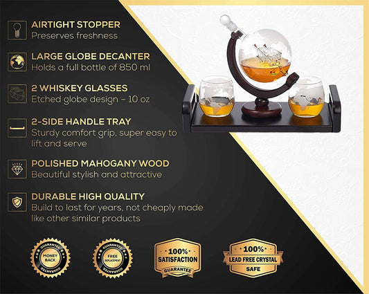 Bezrat - Etched Globe Whiskey Decanter + 2 Whiskey Glasses on Rich