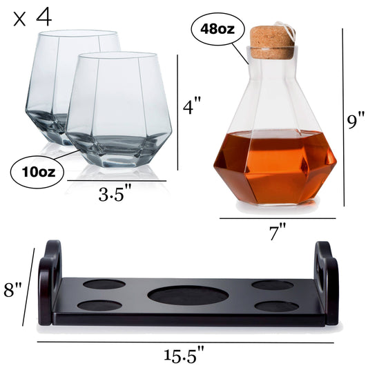 Bezrat - Whiskey Diamond Decanter & 4 Diamond Glasses - Mahogany Tray
