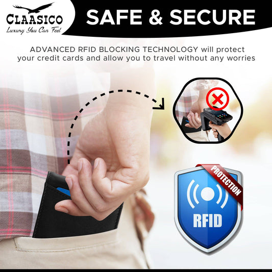 Claasico - Small bifold leather money clip wallet with pull strap: Black